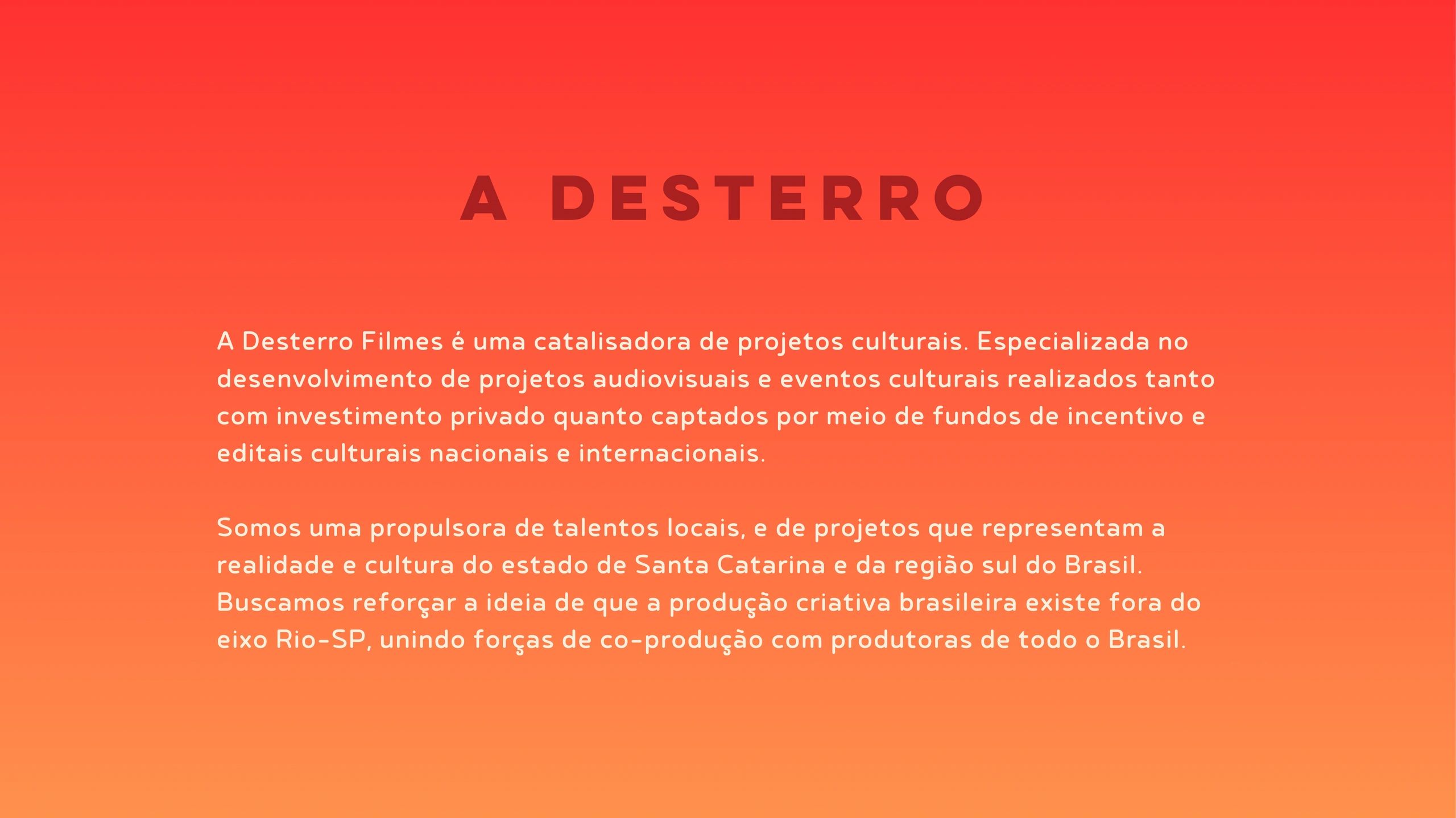 A Desterro Filmes se fortaleceu nos últimos anos nas áreas de desenvolvimento de projetos audiovisuais. Após a concepção de diversos projetos, fortalecidos e aprofundados para inscrições em fundos de incentivo (nacionais e internacionais) e editais (municipais, estaduais e nacionais), os objetivos da produtora também se fortaleceram. Hoje, a Desterro Filmes visa não apenas ser uma catalisadora no desenvolvimento criativo de projetos e suas produções, mas também a propulsão de talentos locais, e de projetos que representem a realidade e cultura de nosso estado. Buscando reforçar a ideia de que a produção criativa brasileira existe fora do eixo Rio-SP, a Desterro Filmes está preparada para dar novos passos com seus projetos, aumentando a sua equipe e criando possibilidades criativas em Florianópolis e já com um Chefe de Desenvolvimento na casa, Pedro Cruz, responsável pela aquisição e desenvolvimento de novos projetos.